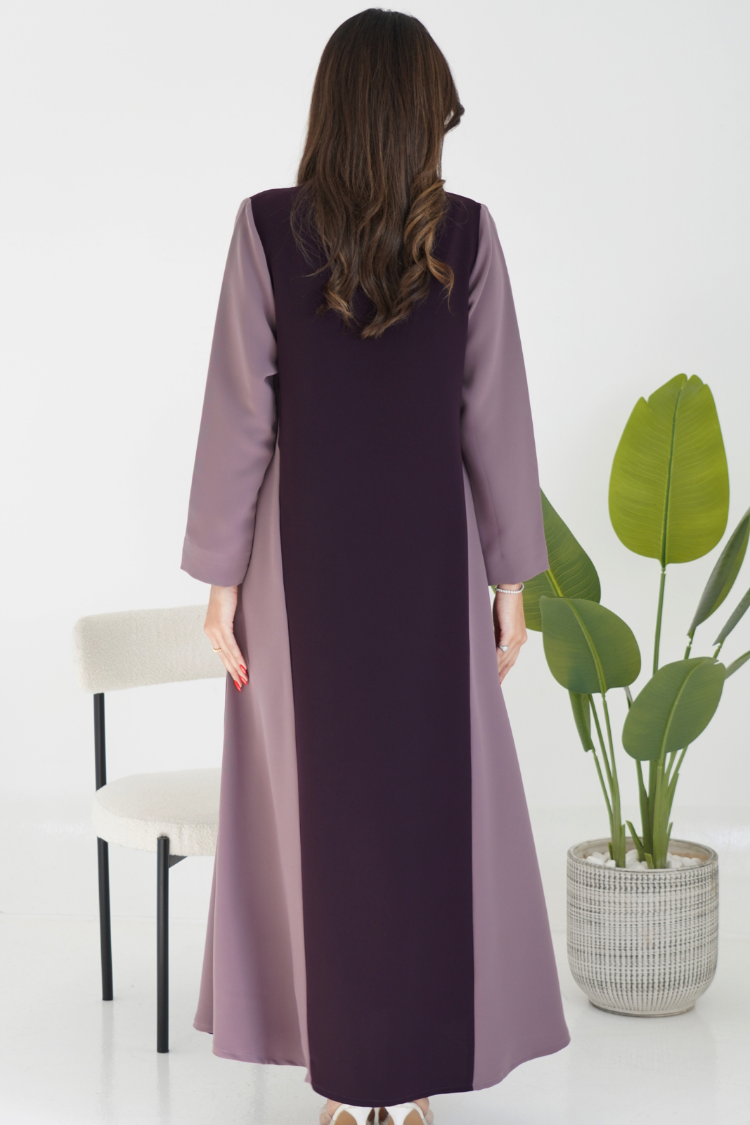 A modern two-tone abaya designed with covered buttons and practical side pockets for a clean, elegant look. Perfect for everyday sophistication, offering both style and comfort in one timeless piece.