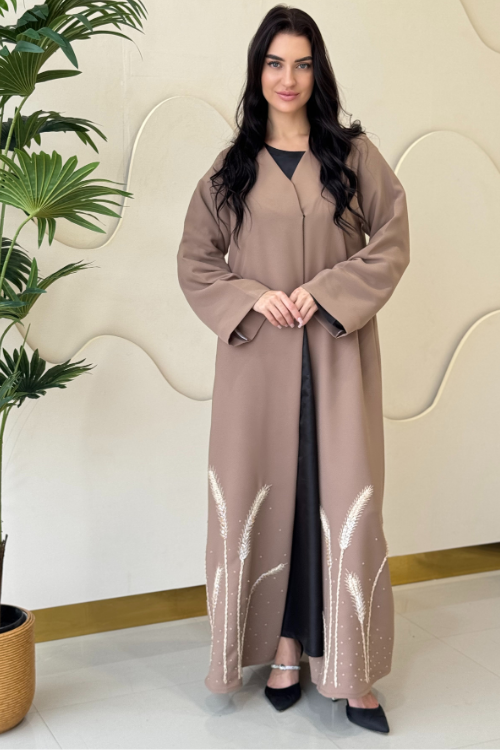 Chic abaya featuring delicate leaf thread embroidery and bead detailing along the hem.