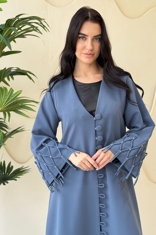 Buttoned abaya with crisscross thread detailing on the sleeves.