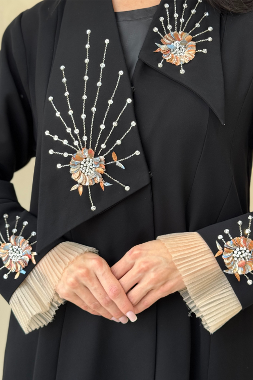 Abaya featuring shell rays beadwork details and beige chiffon attached to the cuffs.