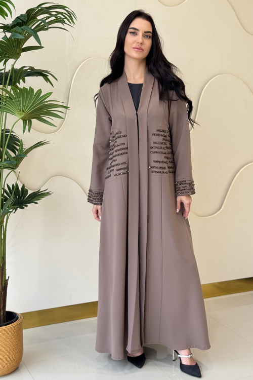 Luxurious abaya with lined beaded handwork on the front and sleeves.