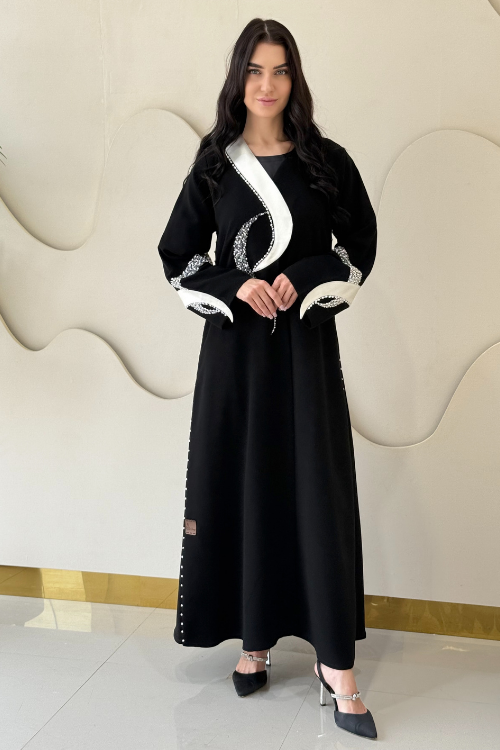 Abaya adorned with pearl embellishments and off-white panel accents.