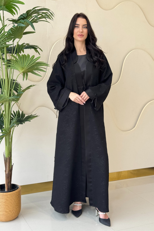 Jacquard abaya featuring belted rope accents.