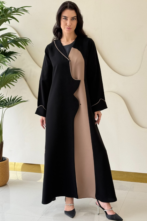 Two-toned abaya with piping accents and a collar on one side.