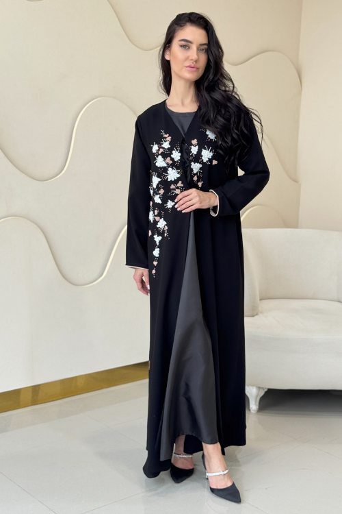 Abaya featuring butterfly embroidery on the front and piping details on the back.