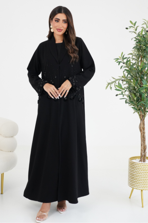 Collared abaya featuring embroidery on the bodice and on the sleeves