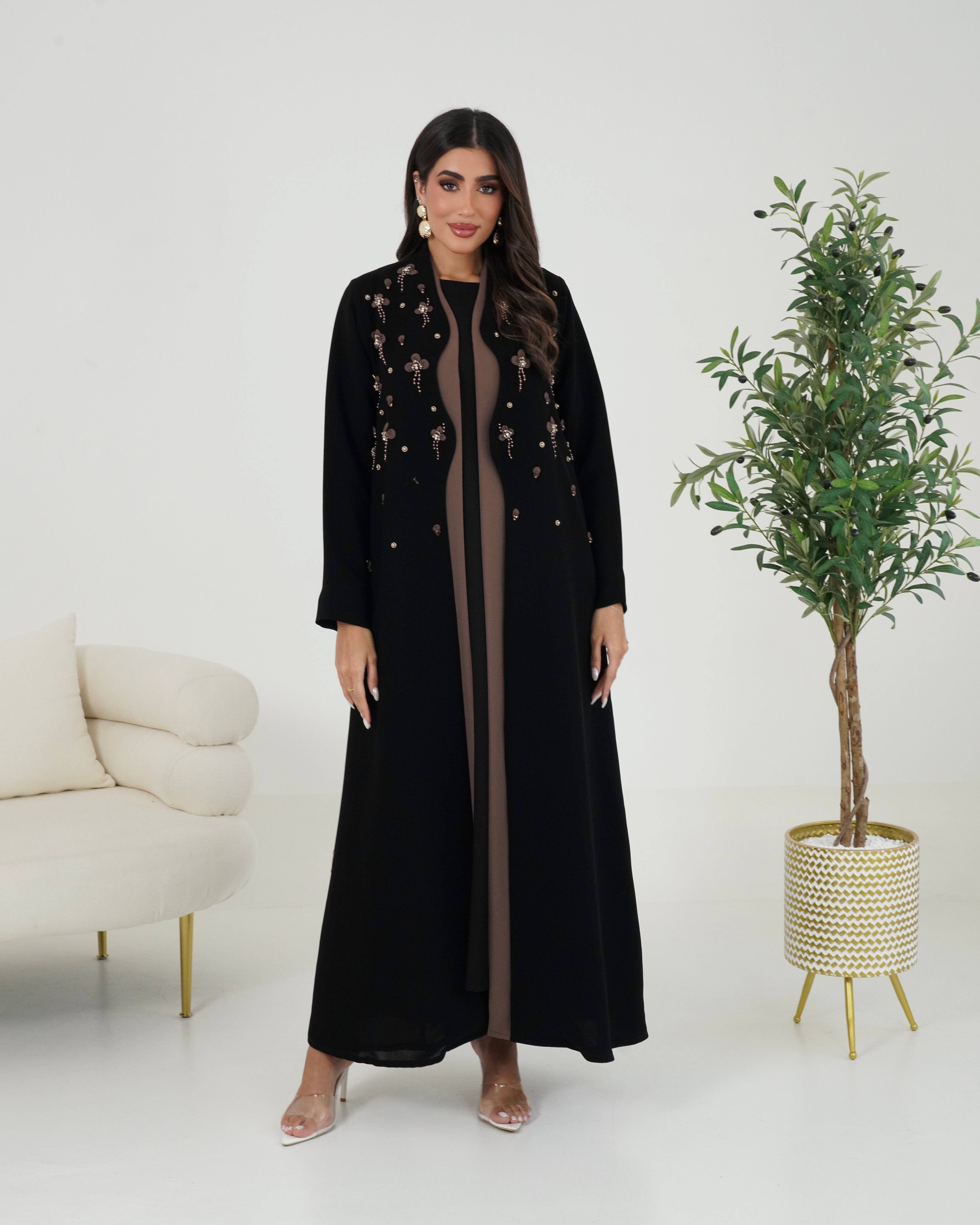 This abaya features delicate embroidery on the top front, accented with a subtle two-tone detail along the front line.