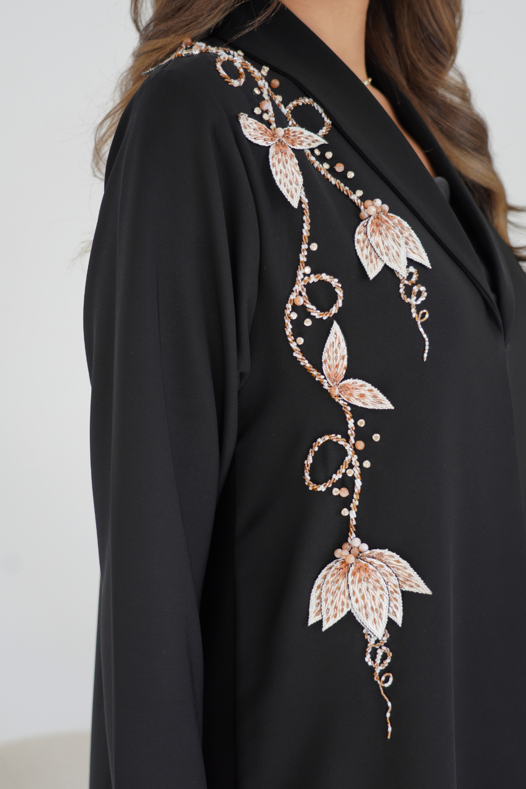 A sophisticated collared abaya featuring elegant embossed embroidery on the shoulders, front, and back. Designed for a refined, structured look that’s perfect for both daily wear and special occasions. Crafted with timeless detail and effortless elegance.