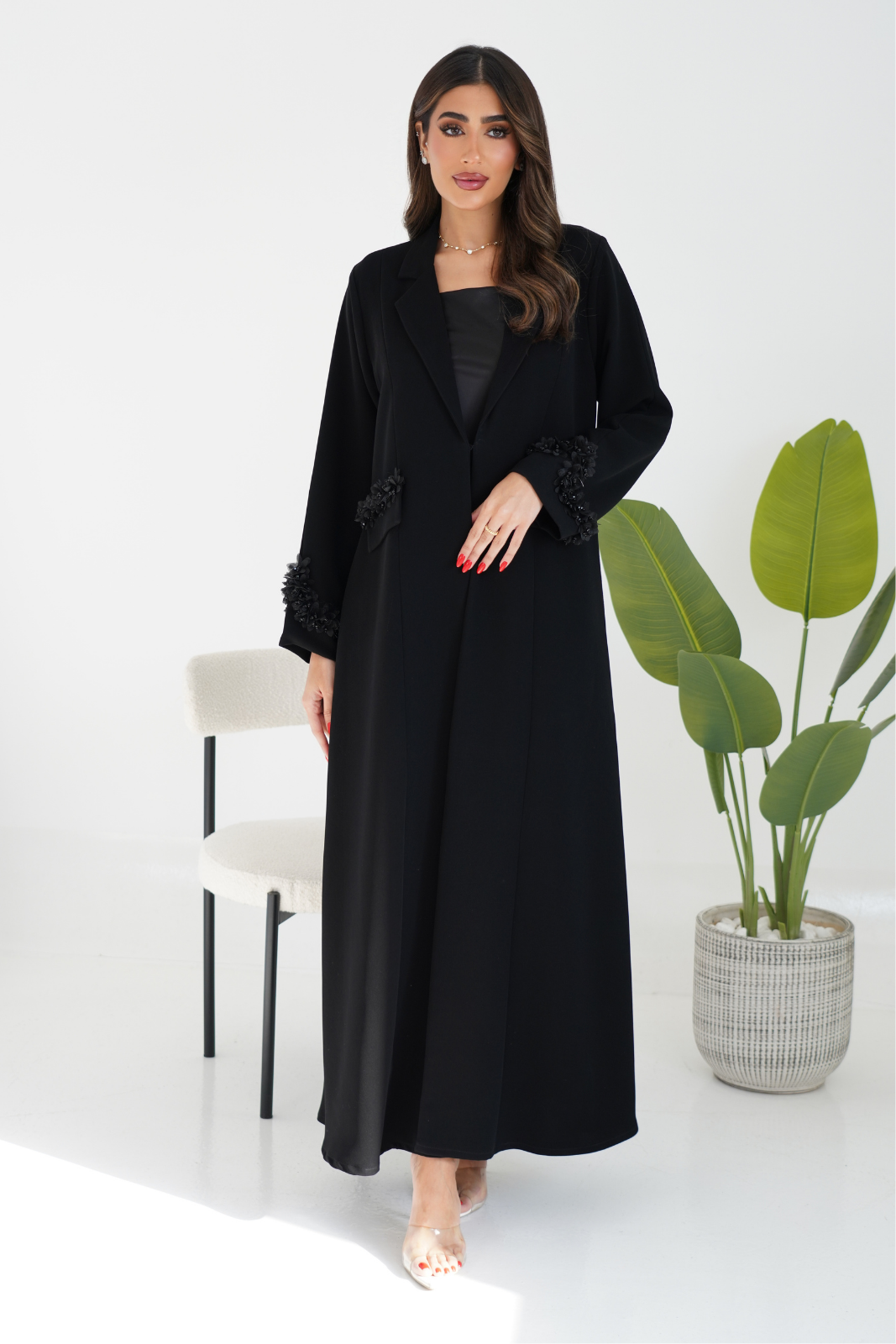 A stylish collared abaya featuring attached detailing on the patch pockets and sleeves for a refined, modern look. Designed with clean lines and elegant touches, this piece is perfect for both everyday wear and elevated occasions.