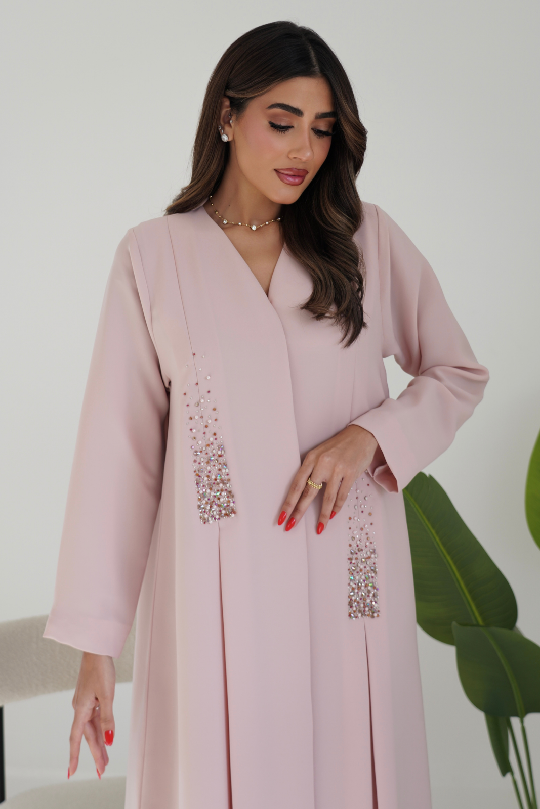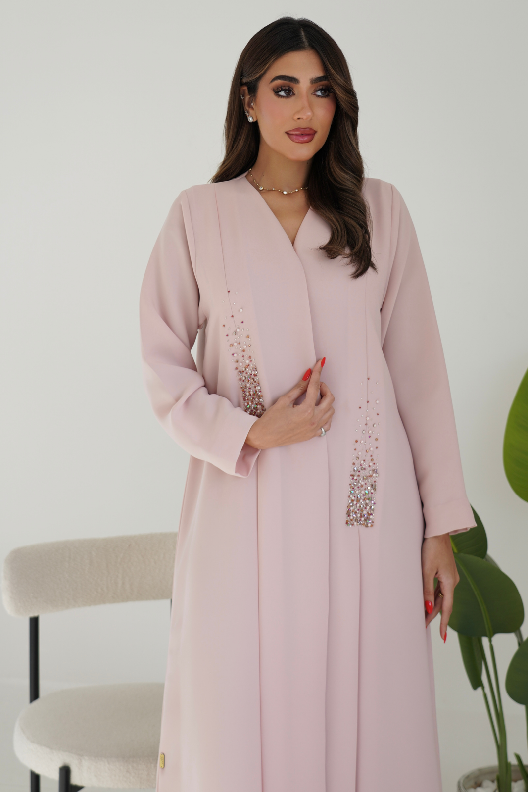 A refined abaya featuring elegant front embroidery paired with soft pleated detailing for a graceful, structured look. Perfect for elevating your everyday style with timeless sophistication.