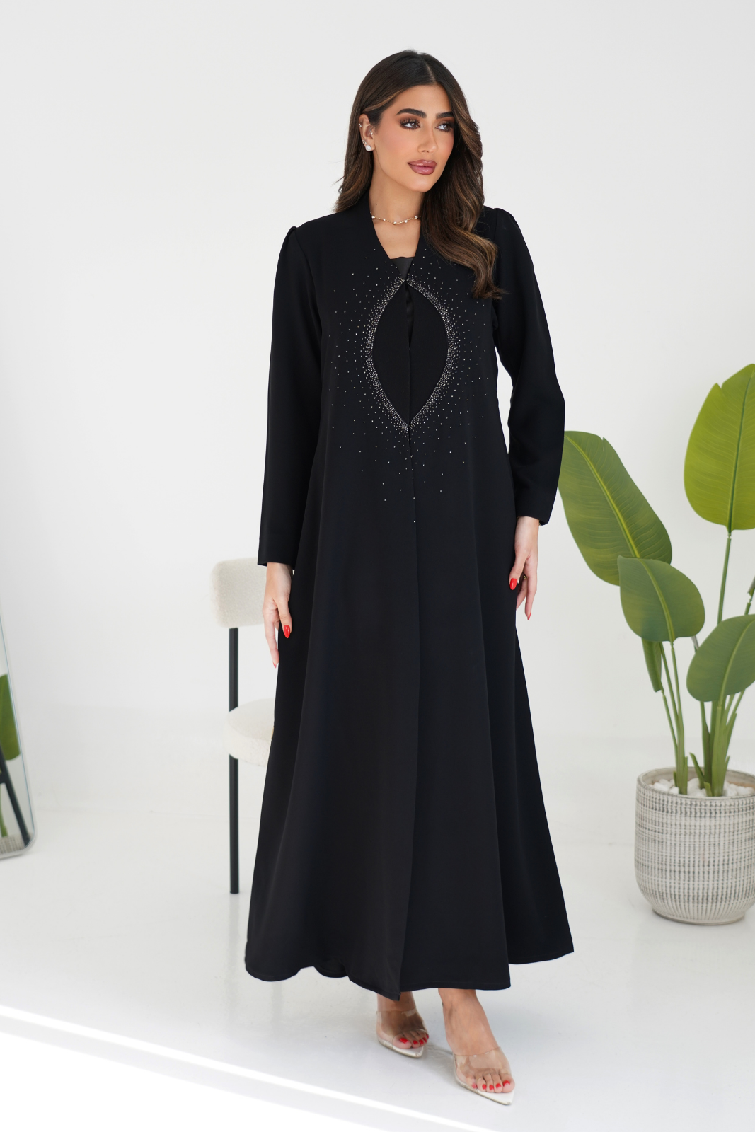 A graceful abaya featuring unique oval-shaped beadwork that adds subtle sparkle and sophistication. Soft gathers on the shoulders create a flattering silhouette, combining structure with effortless flow. Crafted from lightweight, comfortable fabric, this piece is perfect for both special occasions and elegant everyday wear.