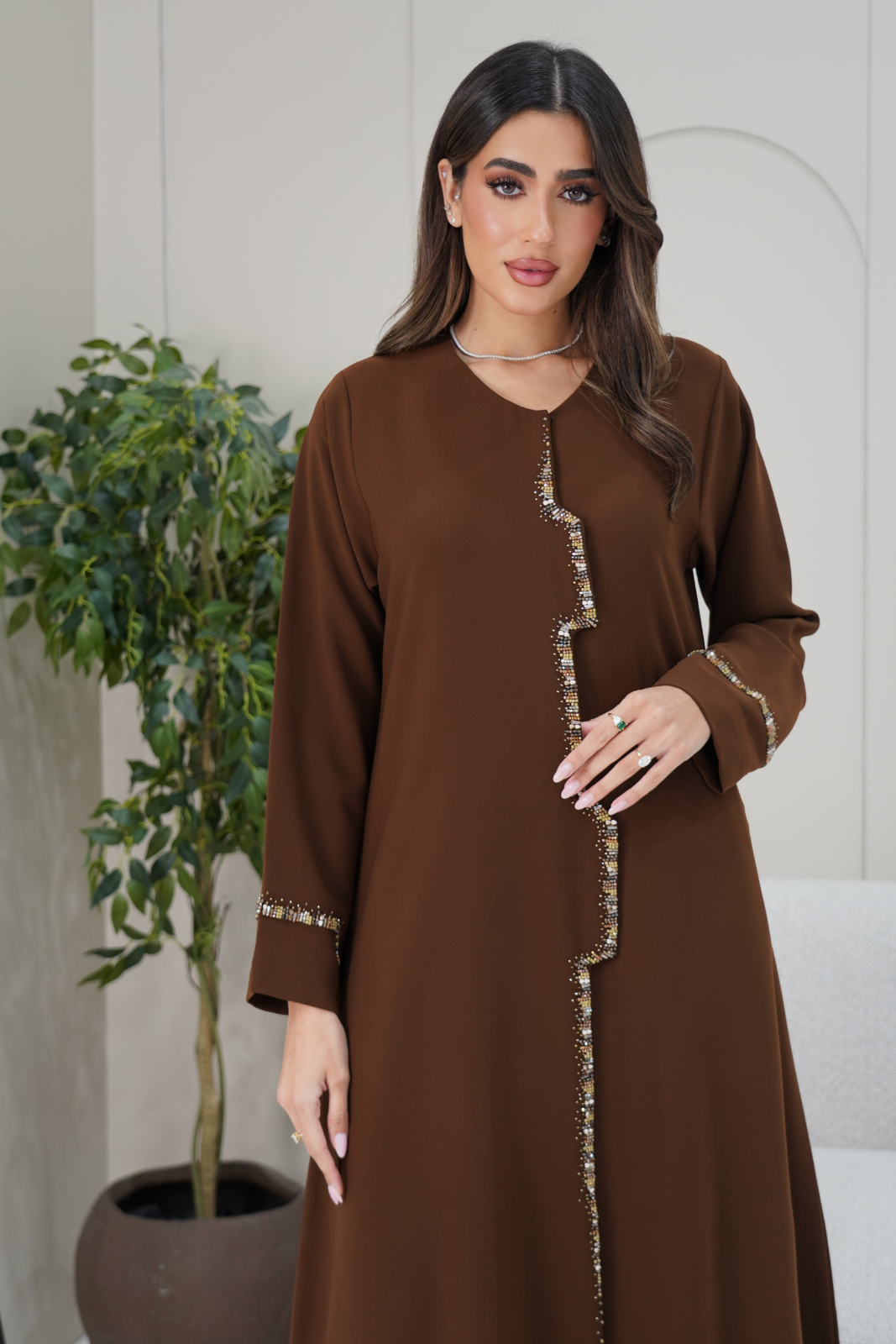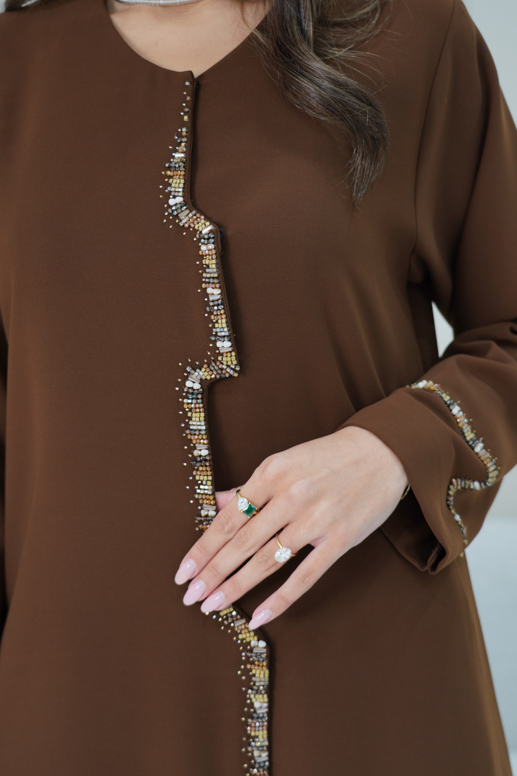 A graceful abaya adorned with elegant beadwork along the front line and cuffs. Designed to add a subtle sparkle and refined detail, making it perfect for both formal gatherings and elevated everyday wear.