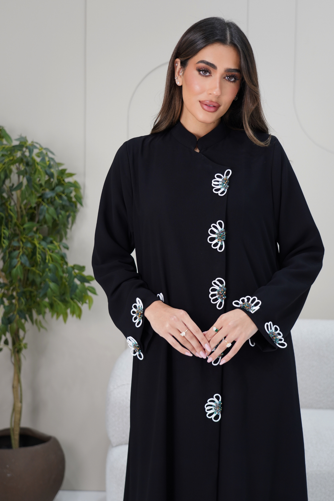 A sophisticated abaya featuring a classic Chinese collar and delicate floral embroidery details, combining elegance and grace for a refined, stylish look suitable for any occasion.